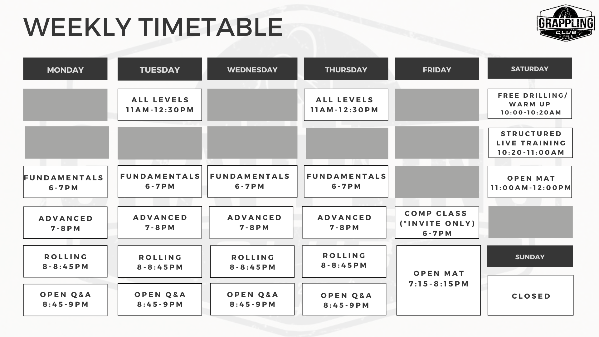 Open Mat - A time for live work and sparring, no techniques are taught.